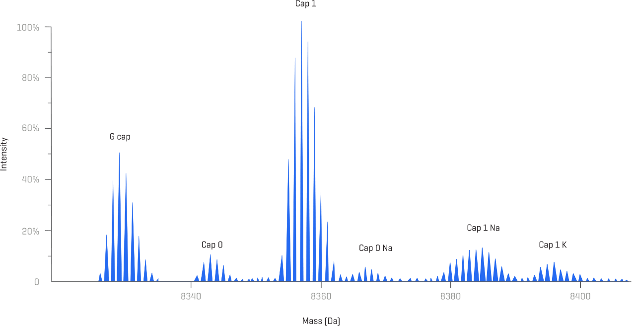 キャピラリー電気泳動(CE)および精密質量分析に基づく溶液を使用して生成された高品質のデータを使用して、キャップ付きmRNA種とキャップなしmRNA種の特性評価と定量を行い、さまざまなキャッピング中間体の区別をより深く掘り下げます。