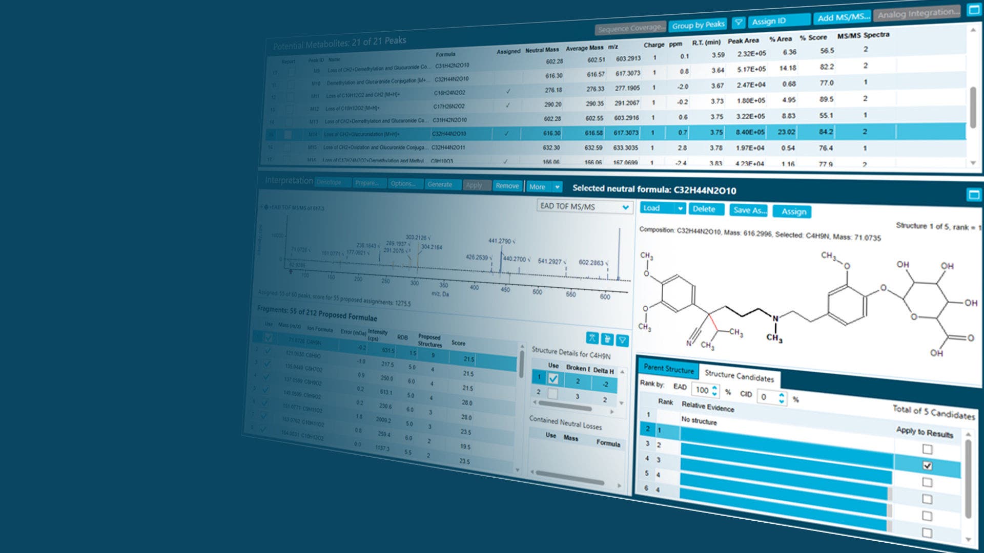 電子励起解離(EAD)と豊富なライブラリを備えたMSおよびMS/MSを基盤とするMolecule Profiler ソフトウェアは、様々な分子の構造を解明するための高精度で柔軟なワークフローを提供します。