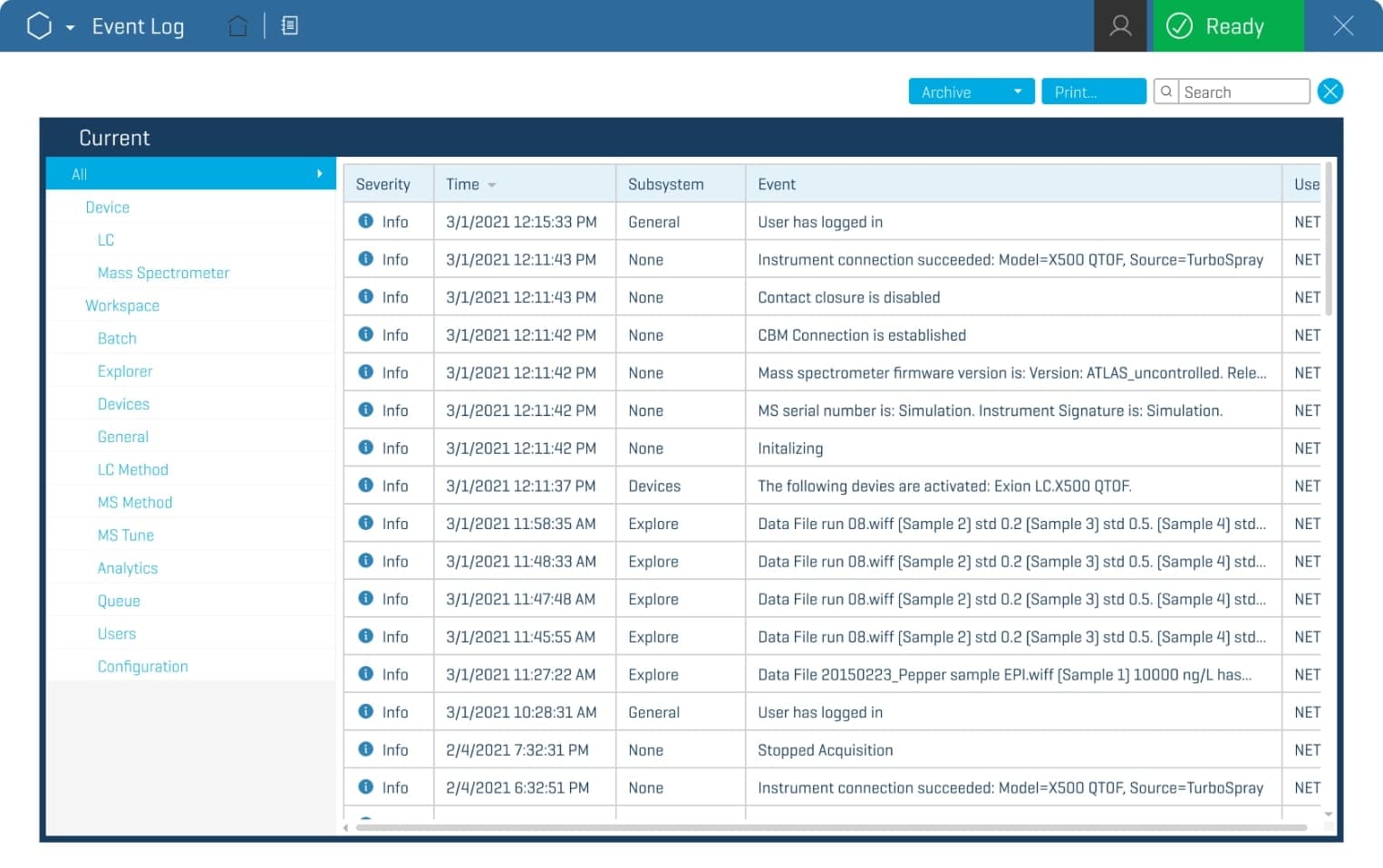 CAC専用の包括的な監査設定により、ユーザーはコンソールワークステーション上で理由、電子署名、タイムスタンプ付きイベント・ログを含む完全なトレーサビリティを設定できます。ユーザープロファイルと権限は、コンプライアンス提出を容易にするために印刷することができます。