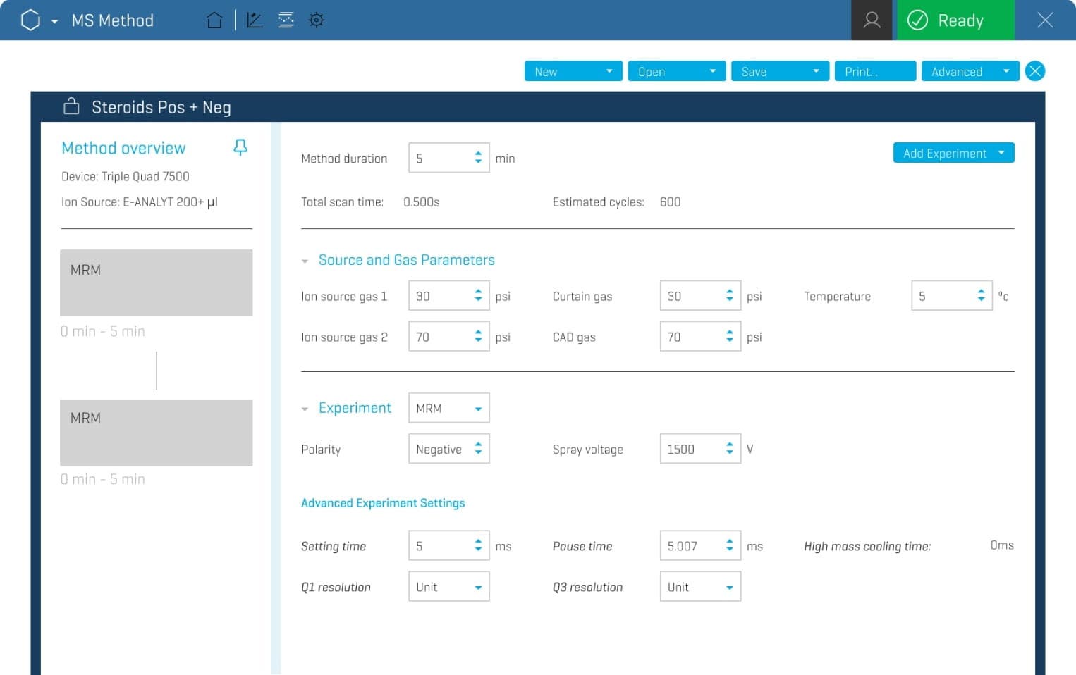 実験セクションでは、TOF MS、MRM、MRMHR など、実行する実験の種類を選択します。複数の実験を選択して分析を行うことができるため、システムはさらに多くのデータを取得できます。