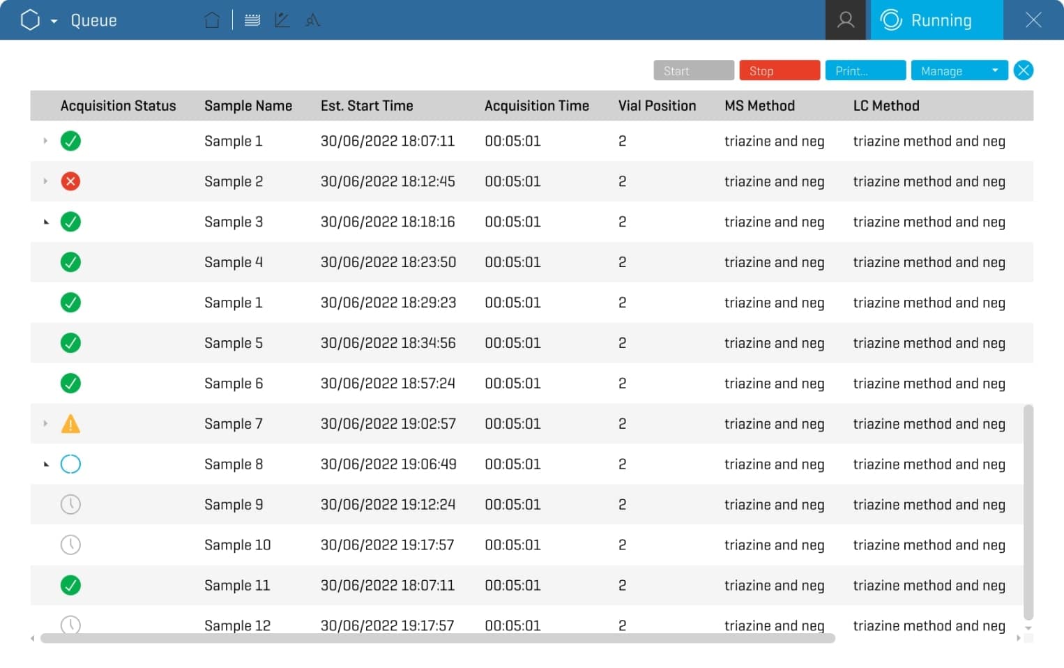 キューワークスペースには、MS メソッドや LC メソッドなど、バッチワークスペースと同様の詳細情報が表示されます。バッチに変更を加えたい場合は、ここからキューを開始および停止することができます。